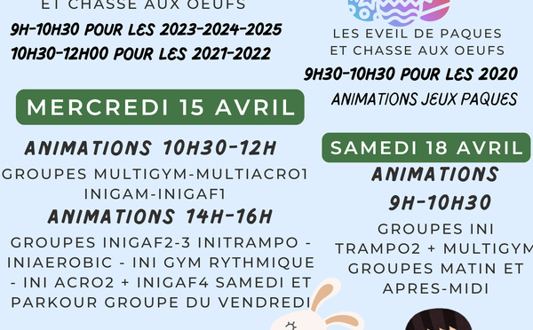 Les 13-14 et 16 avril prochains, l'AMGA vous propose des cours de baby, d'éveil et de gym'vacances ouverts à tous et à toutes. N'hésitez pas à inscrire vos enfants, sur le créneau de votre choix!!...
